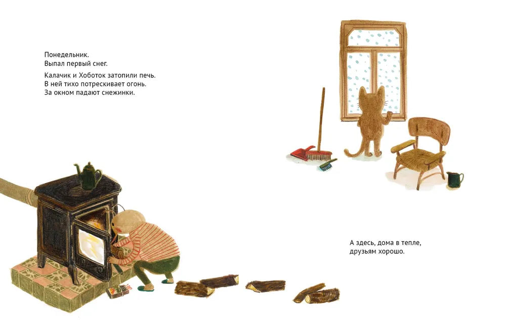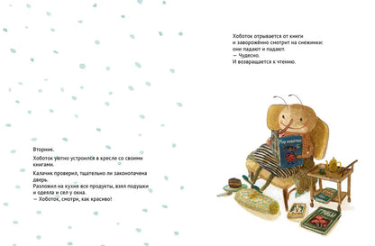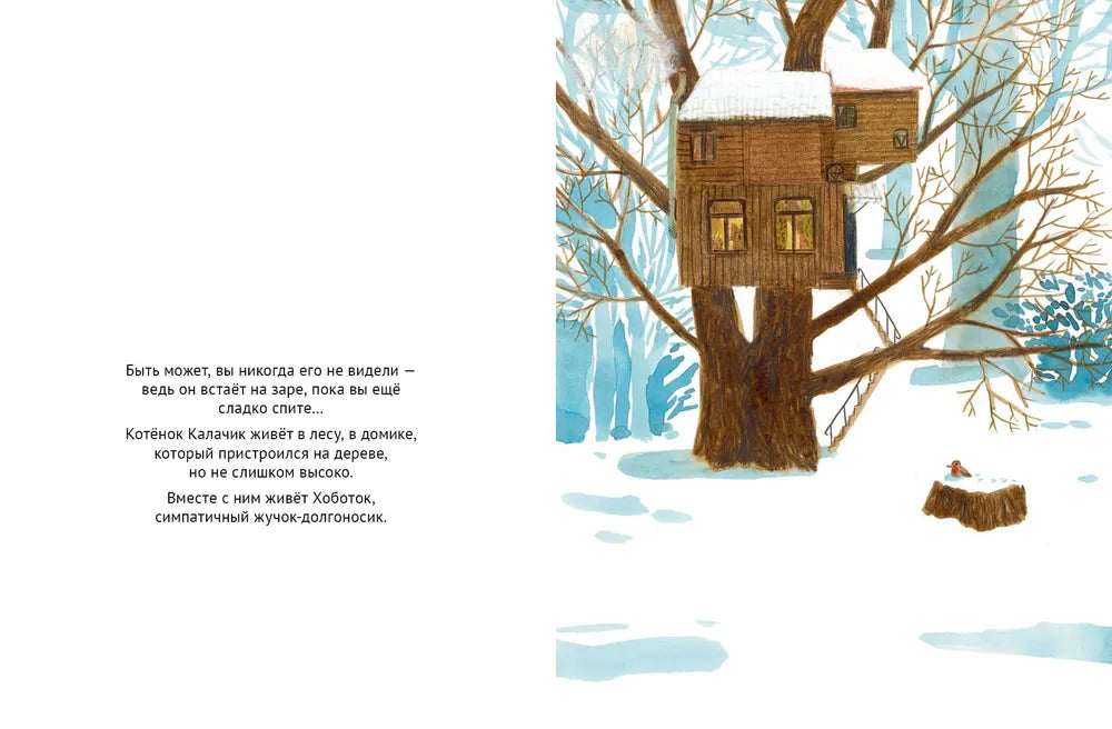 За окном снегопад, а в домике на дереве, где живут котёнок Калачик и жучок-долгоносик Хоботок, тепло и уютно. Вот только Калачику скучно: Хоботок уткнулся в книги и не обращает на него внимания. Даже на снежинки смотреть не хочет! Что же такого интересного в этих книгах, думает Калачик и берёт из стопки книгу о птицах…
