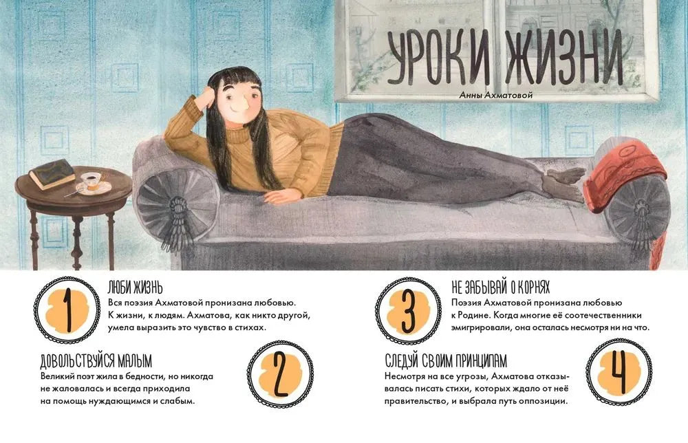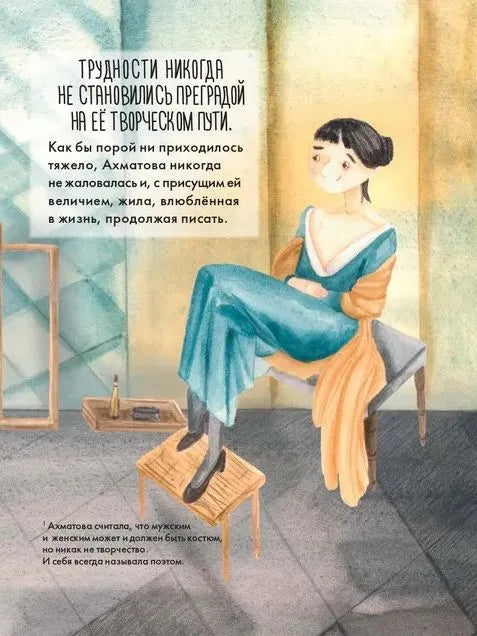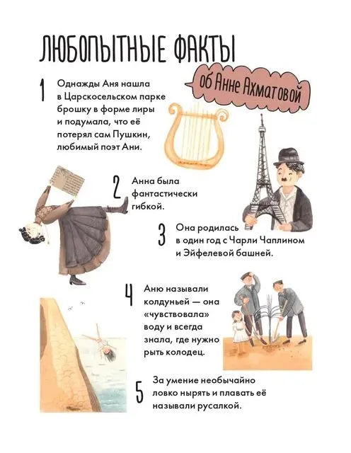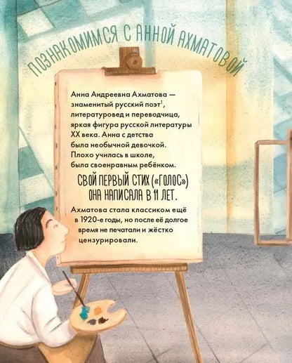 Анна Андреевна Ахматова — знаменитый поэт, литературовед и переводчица, яркая фигура русской литературы XX века. Она стала классиком еще в 1920-е годы, но впоследствии её перестали печатать, а семья Ахматовой подверглась репрессиям. .Трудности никогда не становились преградой на ее творческом пути. Как бы порой ни приходилось тяжело, Ахматова никогда не жаловалась на судьбу, любила жизнь и продолжала писать. Эта вдохновляющая книга привлечет интерес юных читателей к русской классике и истории, а также научит: .не бояться творить; .не бросать начатое, если вас не оценили сразу; .заботиться о семье, ценить друзей и помогать окружающим.